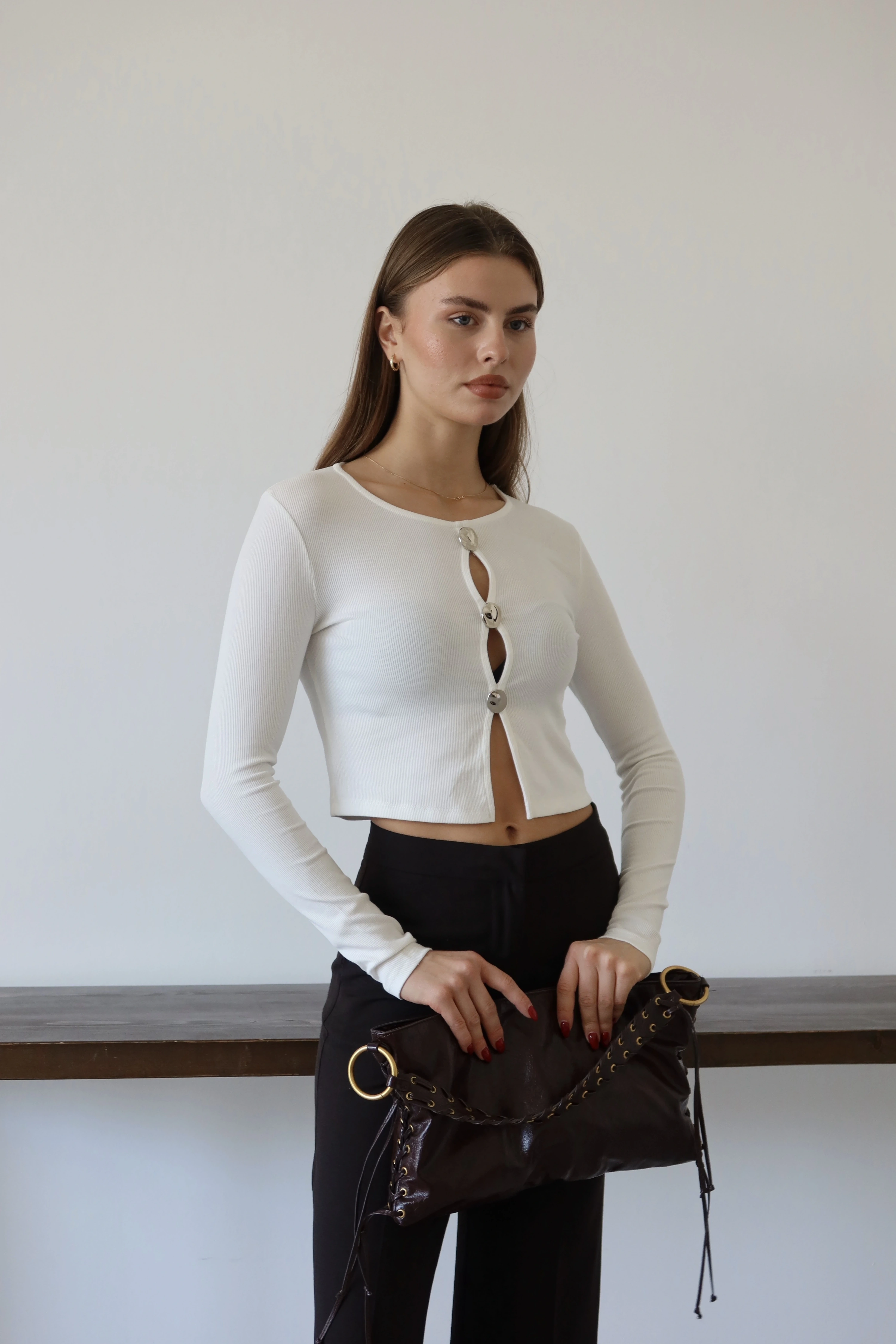 Kolu Yırtmaçlı Balıkçı Yaka T-shırt Beyaz
