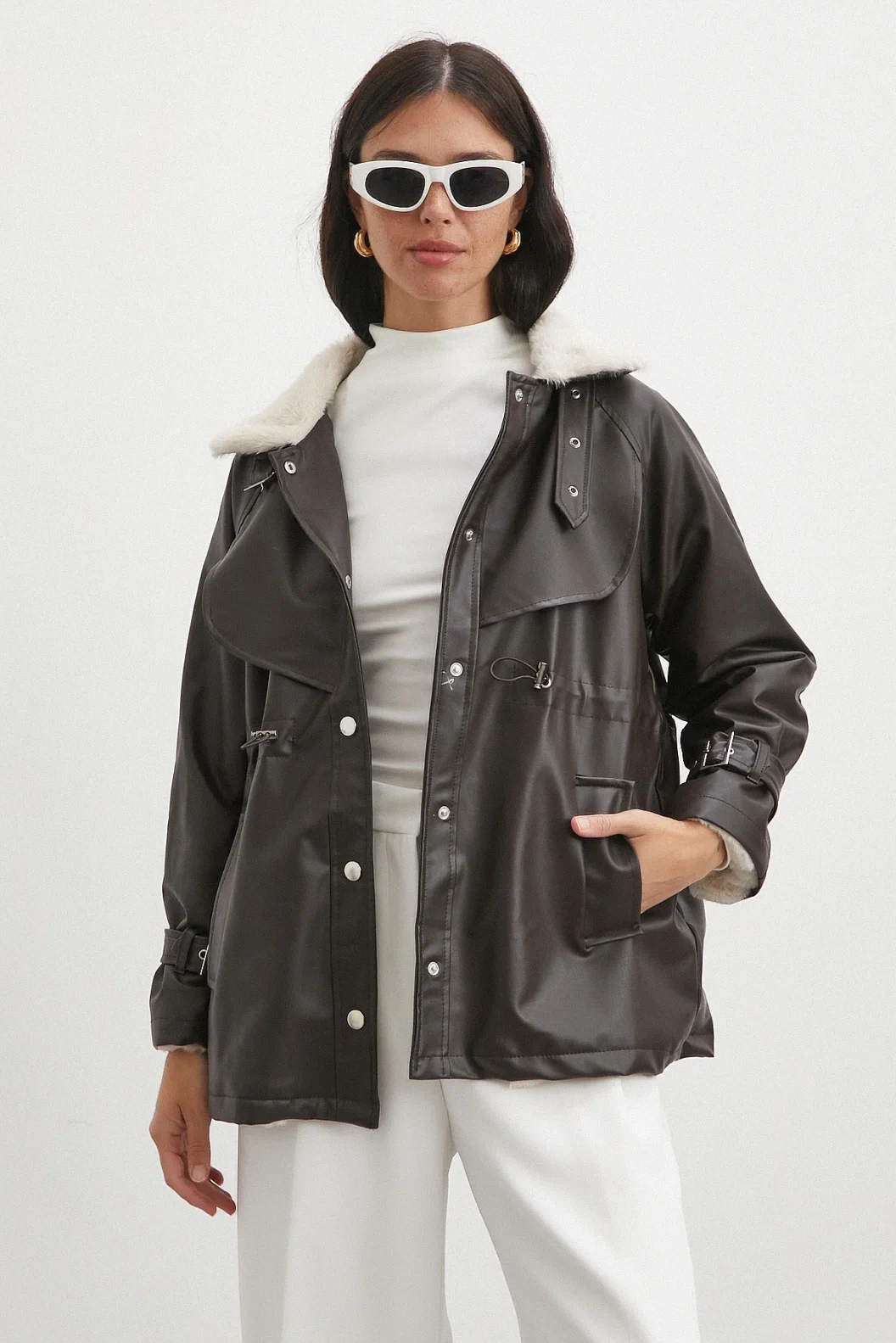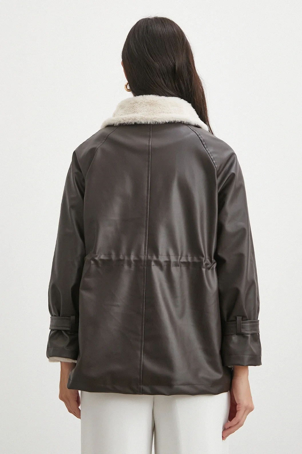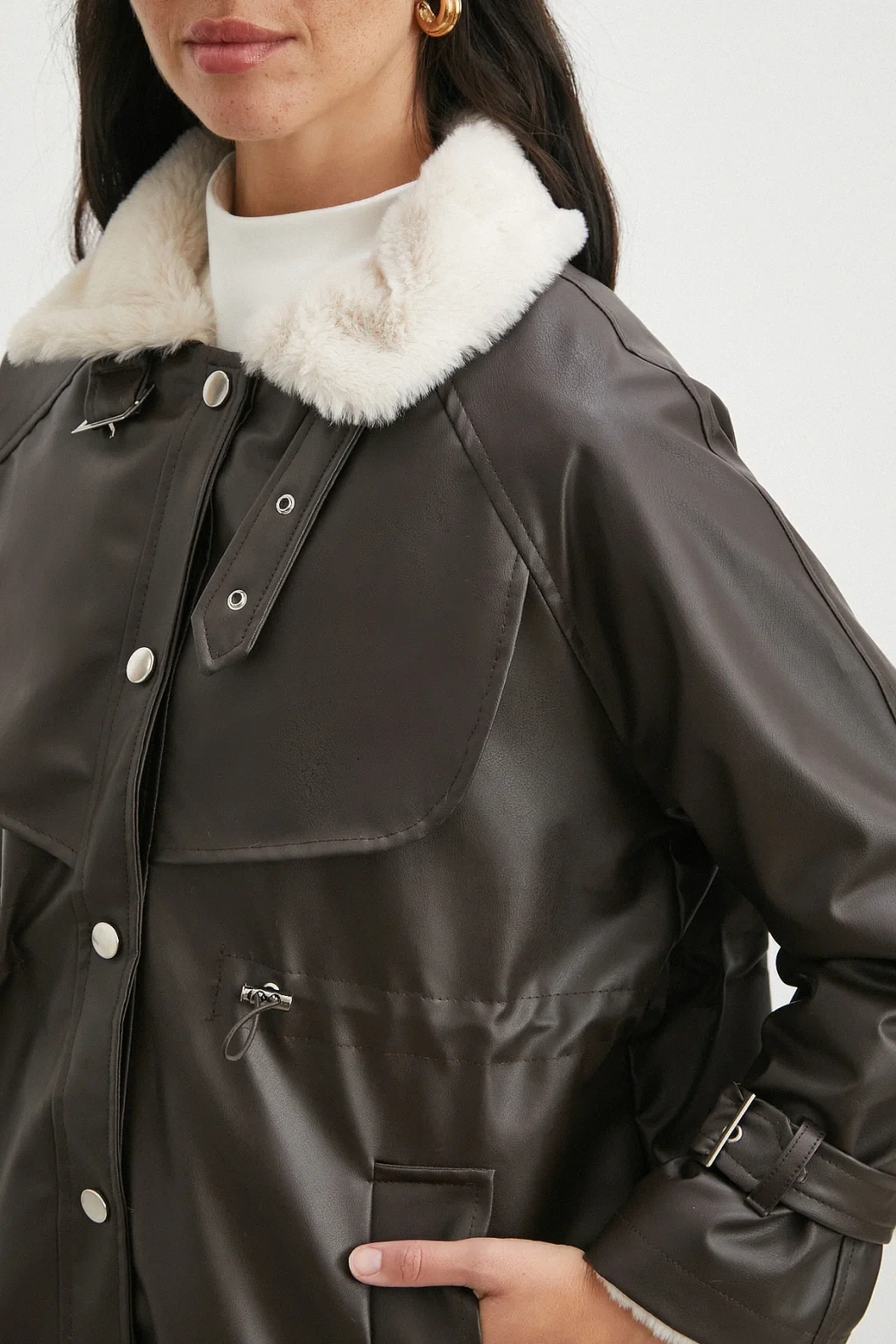 Kürklü Yaka Detaylı Deri Ceket Kahve