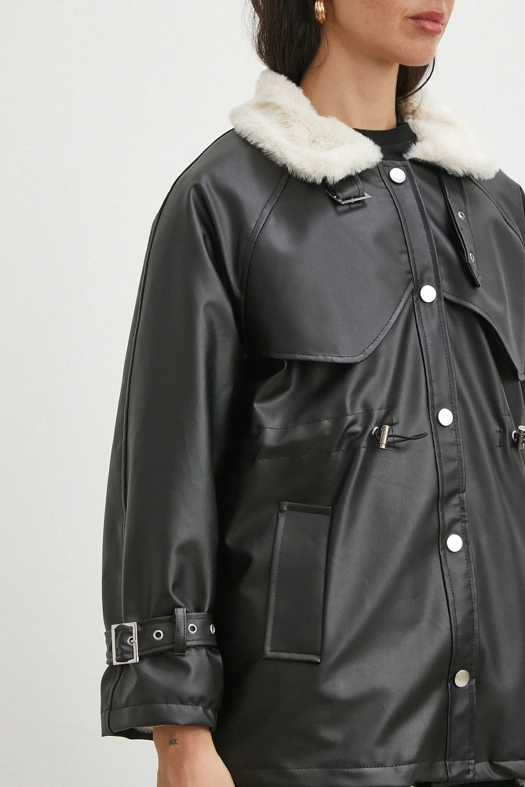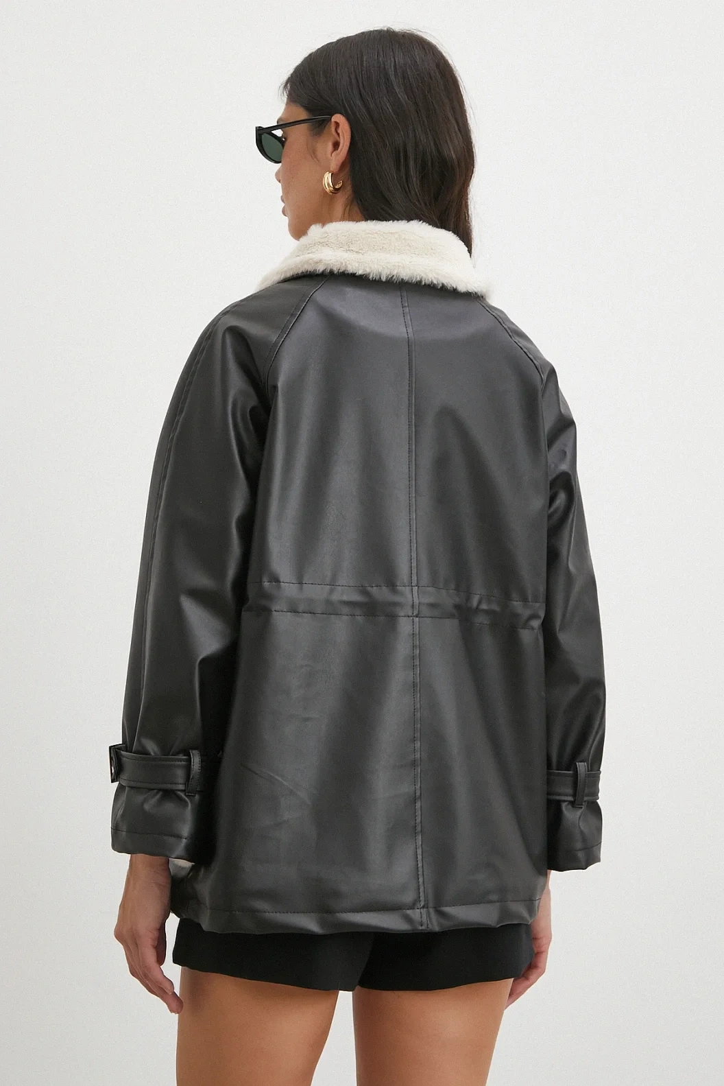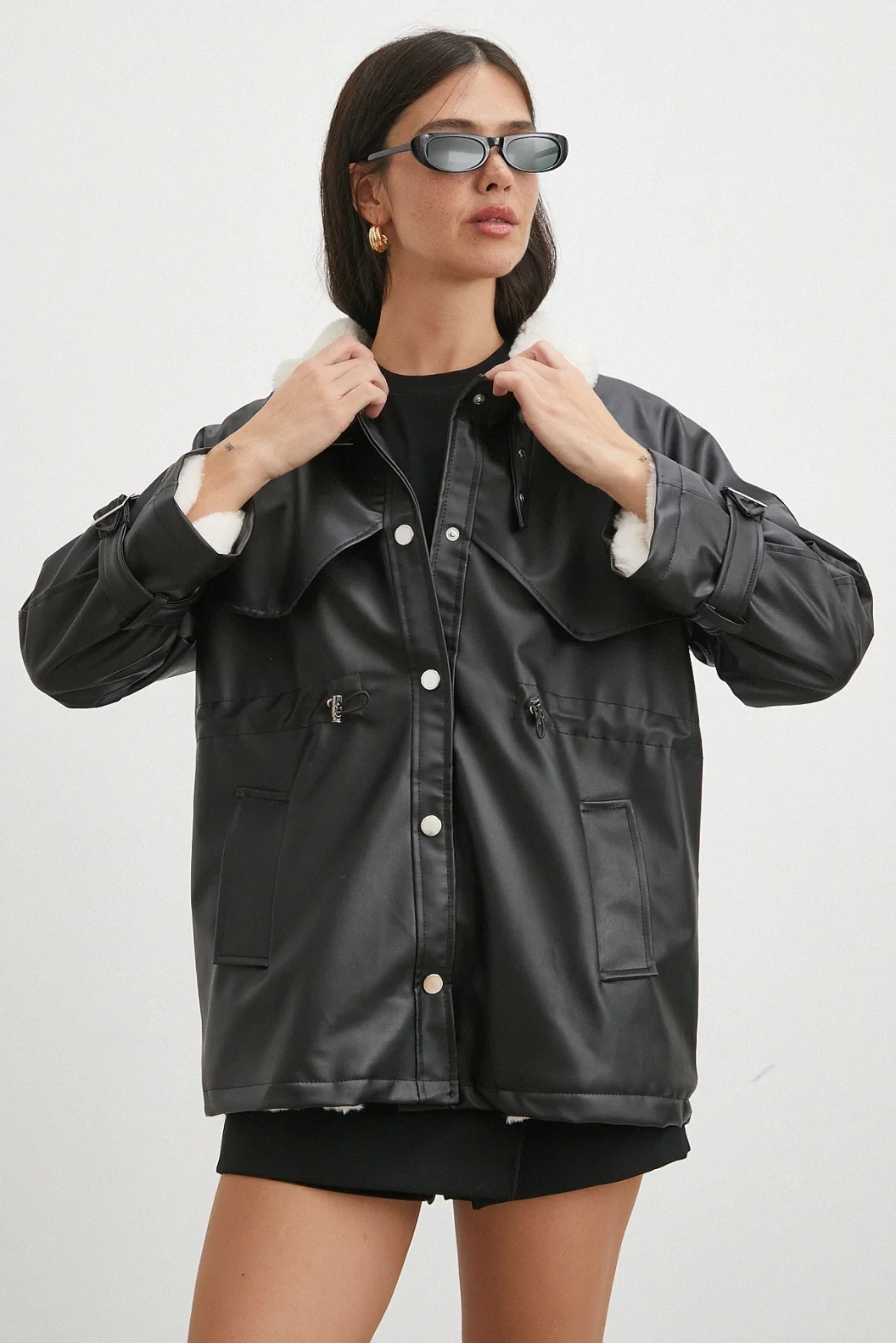 Kürklü Yaka Detaylı Deri Ceket Siyah