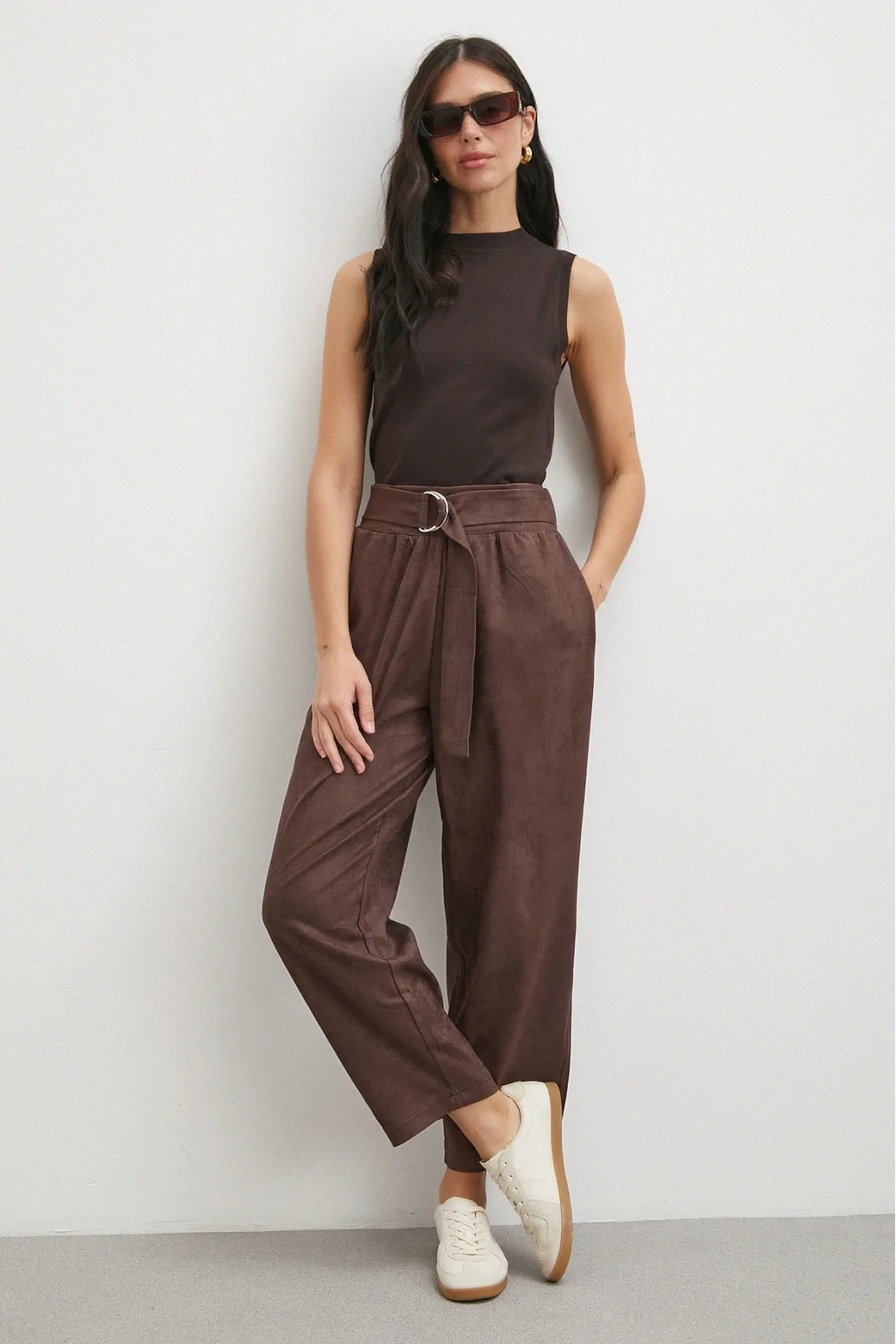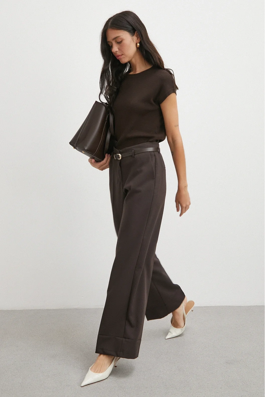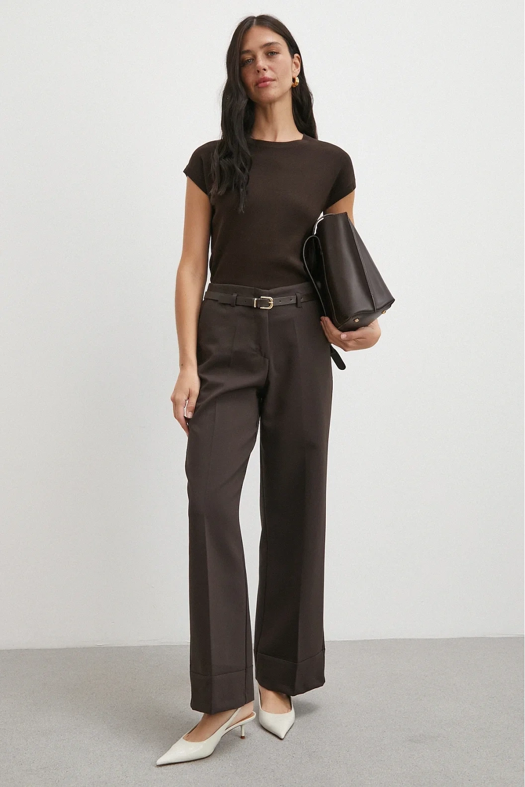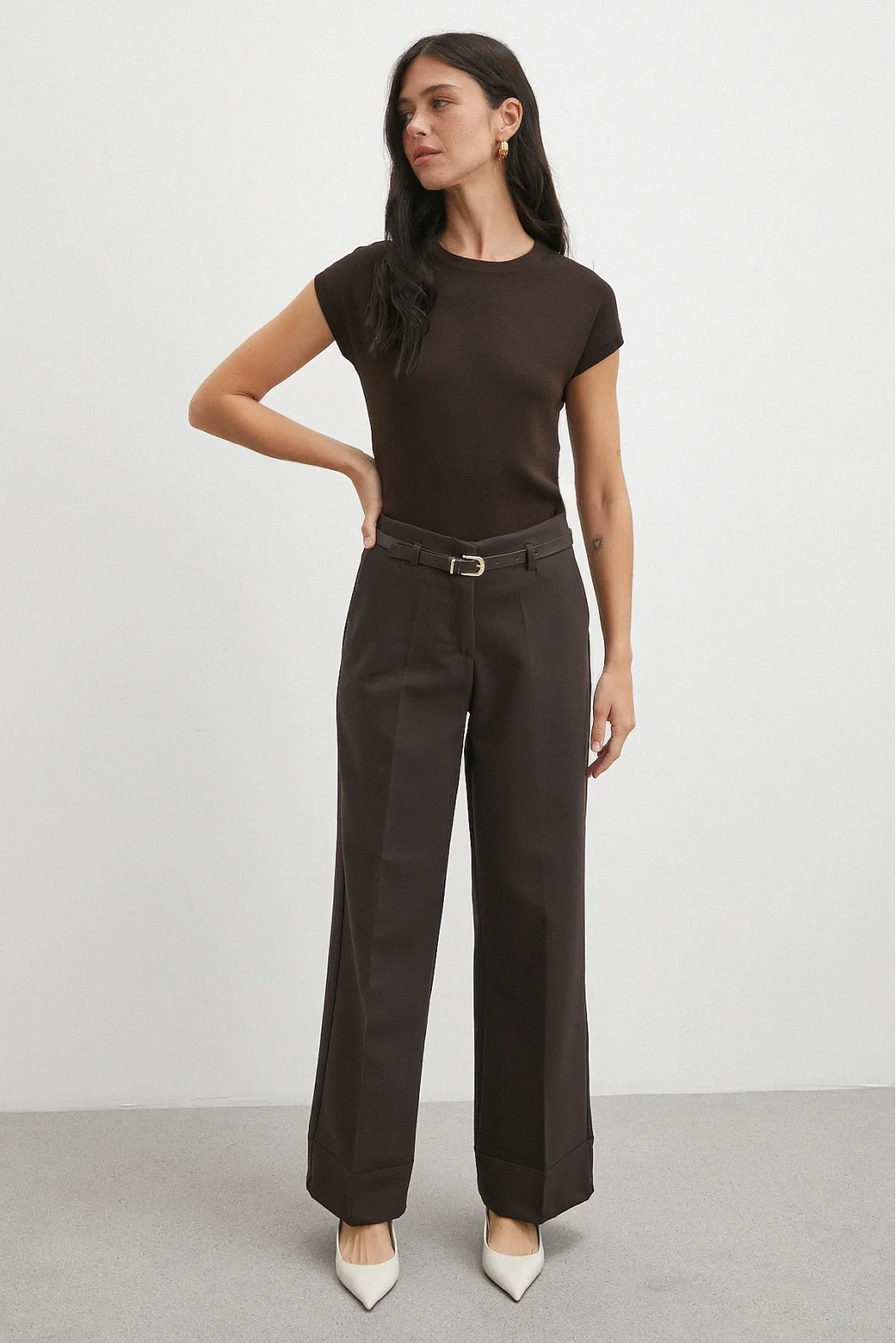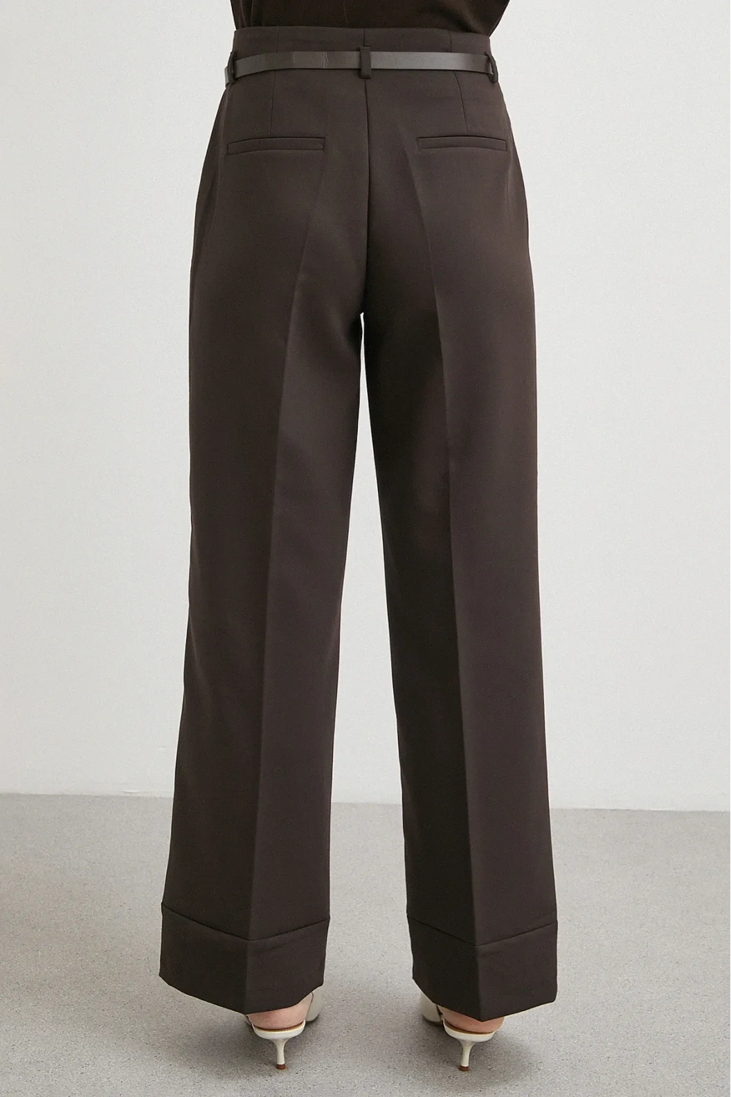 Yüksek Bel Paça Detaylı Kemerli Pantolon Kahve