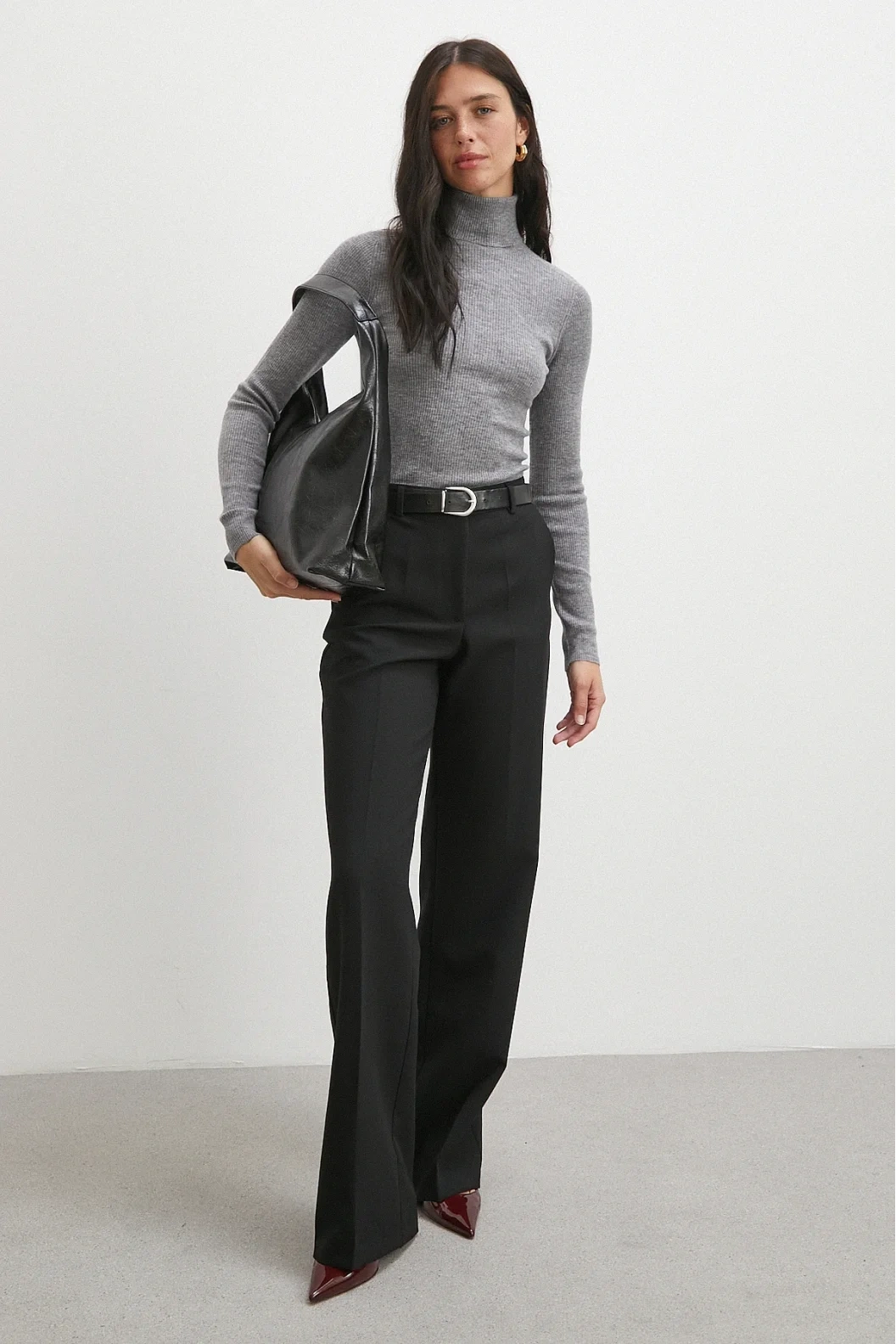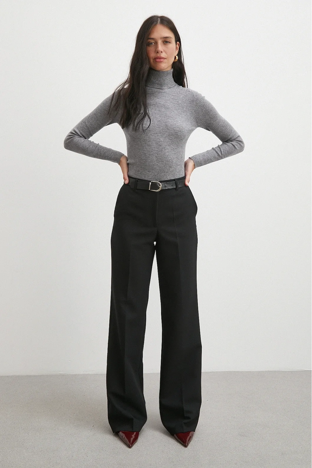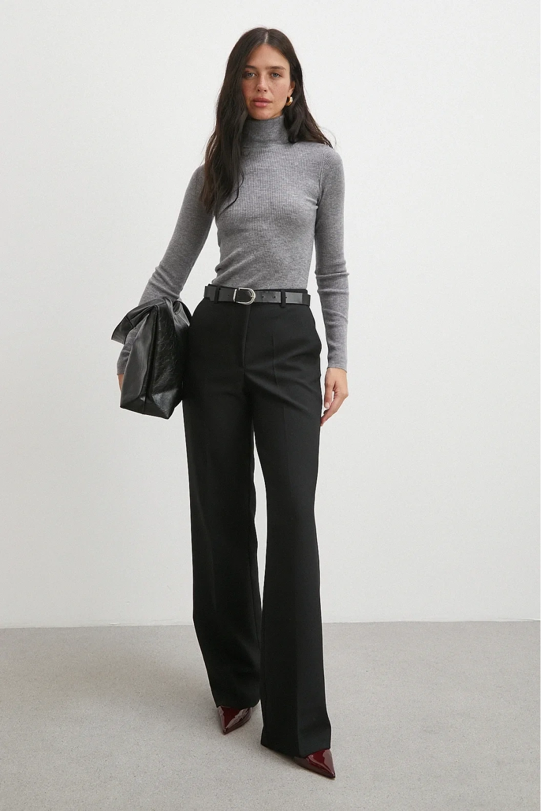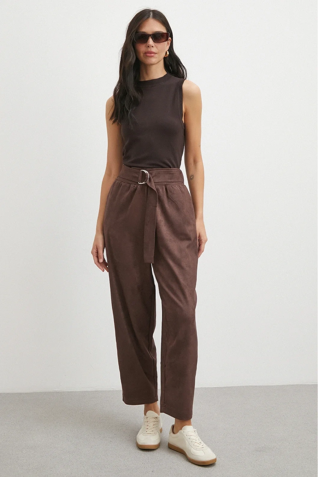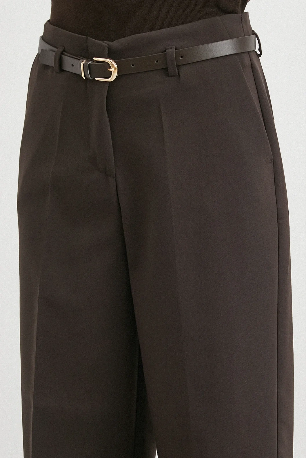 Yüksek Bel Paça Detaylı Kemerli Pantolon Kahve